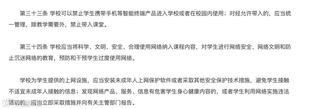 《未成年人学校保护规定》与“五项管理”的要求也逐项进行了衔接。其中规定学校对手机管理的权限,明确规定除教学需要外,禁止手机等智能终端产品进课堂。