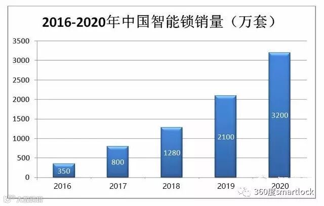 据有关部门统计,2016年,我国的智能锁销量为350万套,2017年,智能锁销量达到了800万套,而2018年上半年,智能锁行业订单数据已超过2017年全年的产销量,达到830万套,预计今年全年智能锁销量有可能达到1300万套左右,而2020年将有望达到3200万套。