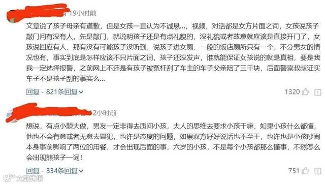 网友2:想说,有点小题大做,男友一定非得去质问小孩,大人的思维去要求小孩干嘛,如果小孩什么都懂,他也不会有意或无意去冒犯,也许是态度问题,如果双方好好说话也不至于,也许小孩吵闹本身事前影响了两位用餐,才会出现后面的事。