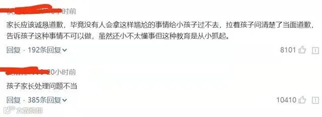 网友2:家长应该诚恳道歉,毕竟没有人会拿这样尴尬的事情给小孩子过不去,拉着孩子们清楚了当面道歉,告诉孩子这种事情不可以做,虽然还小不太懂事但这种教育是从小抓起。