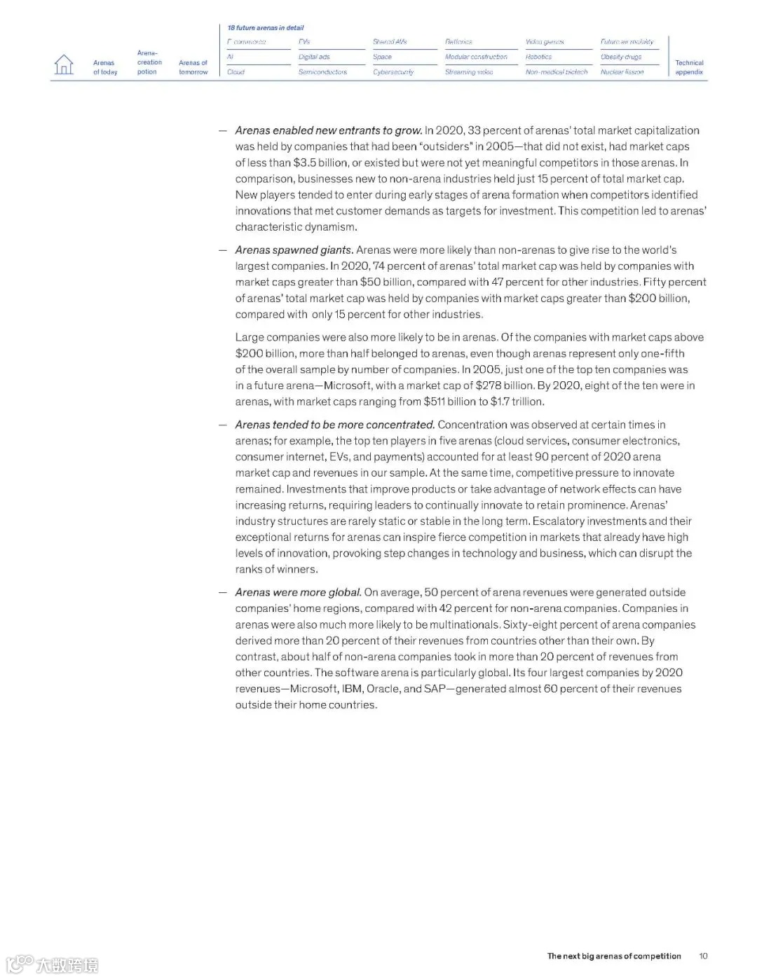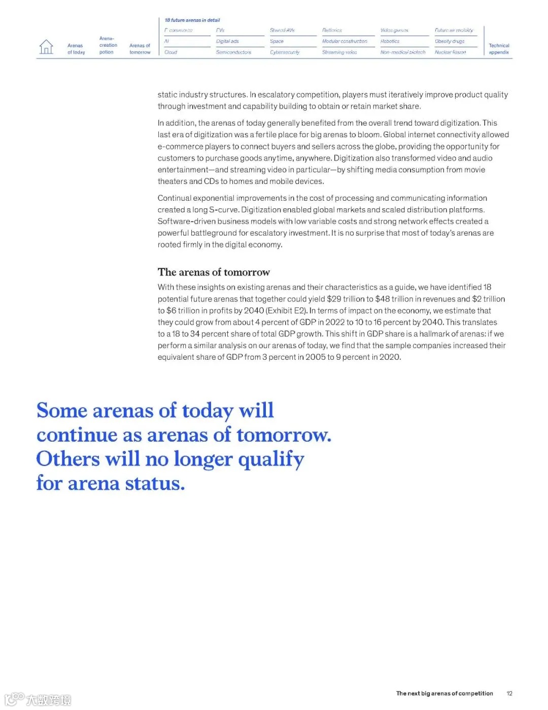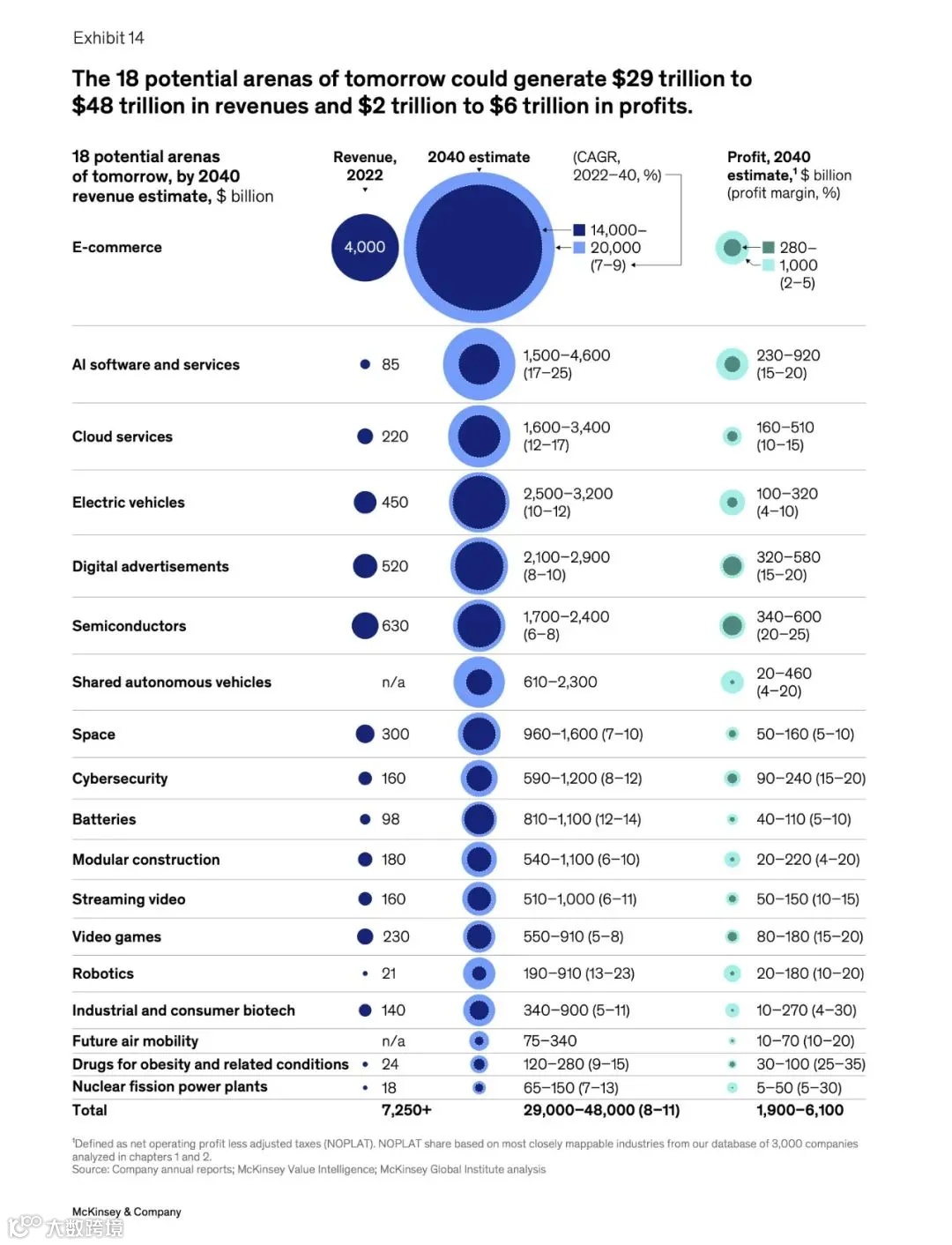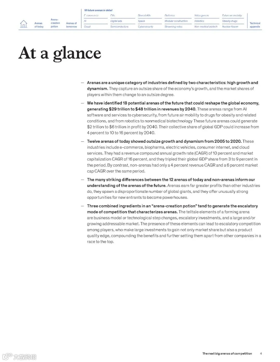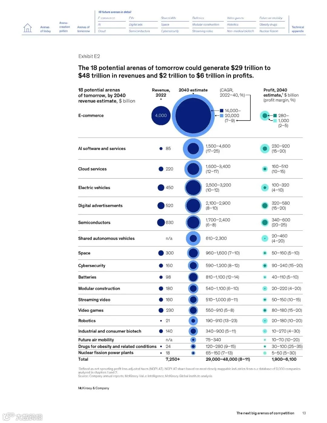 近日,麦肯锡发布了一份213页的重磅报告《2024年下一代“竞技场”报告》 (“The next big arenas of competetion”)。该报告指出,从现在到2040年,有“18个能够重塑全球经济的未来领域”:电子商务,人工智能软件服务,云服务,电动汽车,数字广告,半导体,共享自动驾驶汽车,空间,网络安全,电池,模块化结构,流媒体视频,电子游戏,机器人,工业和消费者生物技术,未来空中机动,肥胖治疗及相关药物,核裂变发电等,以下为报告摘选。