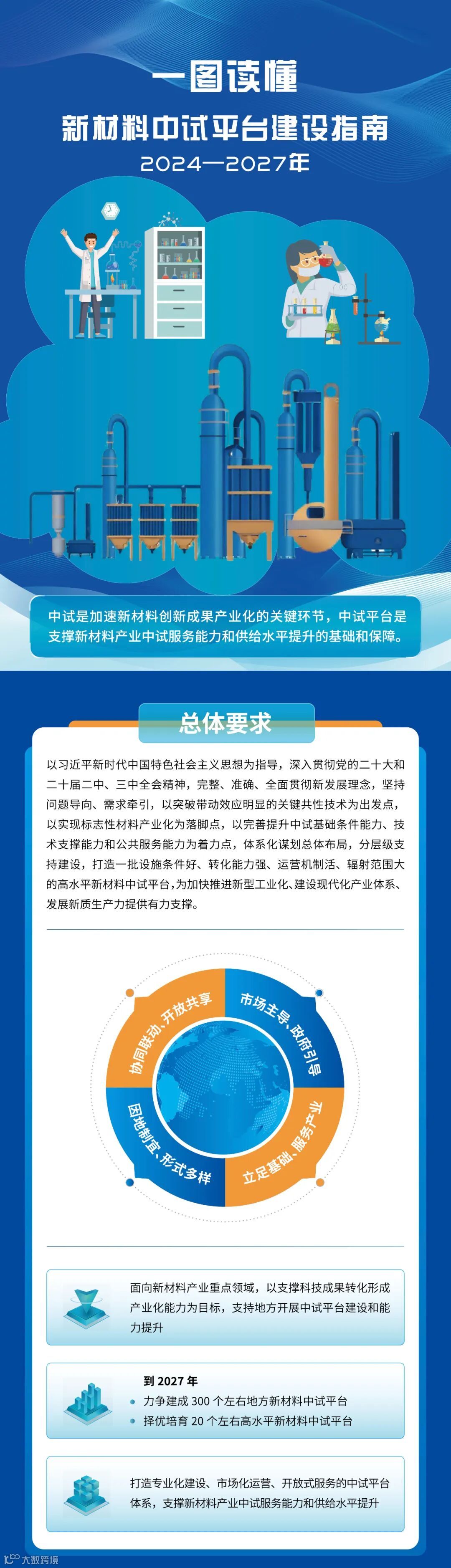 10月11日,从工业和信息化部官网获悉,近日,工业和信息化部、国家发展改革委联合印发《新材料中试平台建设指南(2024—2027年)》,提出到2027年,我国将围绕石化化工、钢铁、有色金属、无机非金属、前沿材料5大领域,建成300个左右地方新材料的测试平台,也就是业内俗称的中试平台,再从中重点培育20个左右的高水平平台。