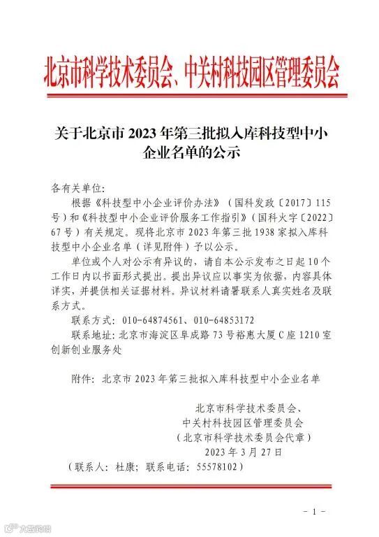 近日,北京市科学技术委员会、中关村科技园区管理委员会公布北京市2023年第三批拟入库科技型中小企业名单,铯镨科技有限公司成功入选,入库编号:202311010608006170。