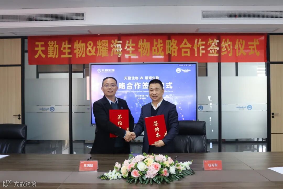 近日,湖北天勤生物科技集团股份有限公司(以下简称"天勤生物")与江苏耀海生物制药有限公司(以下简称"耀海生物")正式达成战略合作。此次合作依托武创院/天勤生物创新药物发现与非临床评价服务平台,整合双方优势资源,致力于为生物医药产业提供覆盖研发全周期的一站式创新服务。