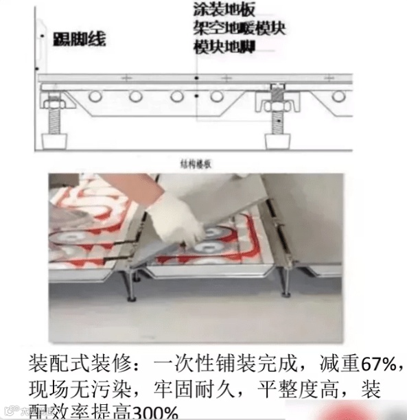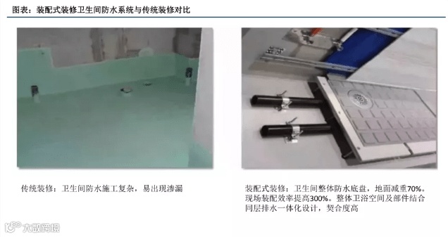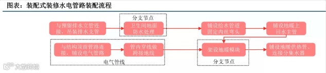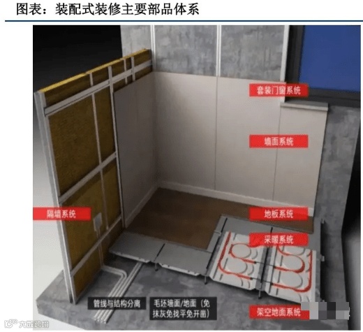 装配式装修主要部品体系包括墙面系统、地面系统、吊顶系统、隔墙系统、暖通系统、电气系统、给排水系统、集成式厨房、集成式卫浴。与传统装修受户型空间限定不同,装配式装修部品规范,内装与结构分离,拆改方便,可灵活变换户型和房间格局。