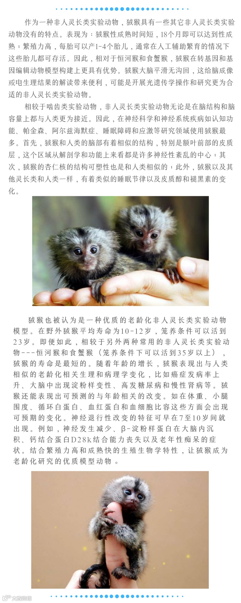 普通狨猴(Callithrix jacchus),是原生活在南美州的一种体型较小的非人灵长类动物。十九世纪六十年代,狨猴开始被用于生物医学研究。它们具有体型小(成年狨猴与成年大鼠大小相仿)、易操控、数量多和价格相对较低等优势。如今,狨猴已被用于基因编辑、神经科学、行为学、生理损伤、基因治疗和老龄化等多个生物医学领域的研究中。