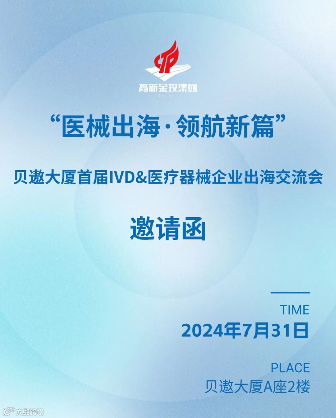 在国内医保控费、医疗反腐的大背景下,随着国内市场竞争的不断加剧,越来越多的医疗器械企业开始着眼海外,寻求更广阔的发展空间和更多的商机,为助力医疗器械产业更好更快融入全球市场,杭州高新金投集团控股有限公司、杭州金投时代企业管理有限公司和杭州高新区(滨江)生物医药创新联合会(BIA)将于7月31日,联合主办“医械出海·领航新篇”贝遨大厦首届IVD &医疗器械企业出海交流会,旨在通过主题分享和圆桌讨论,汇聚业内领军企业、资深专家以及有志于国际市场拓展的企业代表,分享企业“出海经验”、探讨产业发展思路,共谋医疗器械产业的全球化路径!诚挚向您发出参会邀请,期待您的莅临!