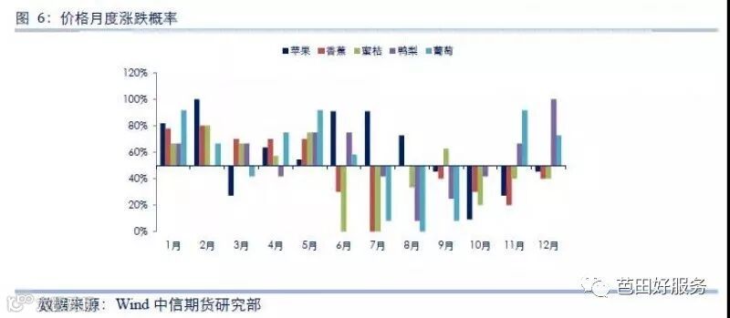 苹果价格上涨概率最大的月份是2月,下跌概率最大的是10月;