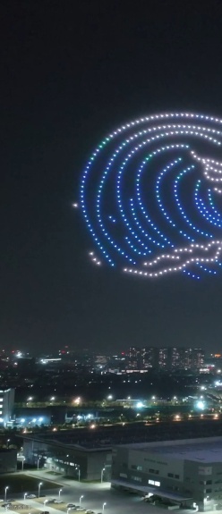 无人机以编队的形式逐渐形成了一条科技跑道,在空中灵动地旋转、变换,汇聚成一幅幅精彩的企业发展画面,随后凝聚成惊涛骇浪,掀起阵阵涟漪,浮现出科技企业“到中流击水,敢立潮头”的文化精神。
