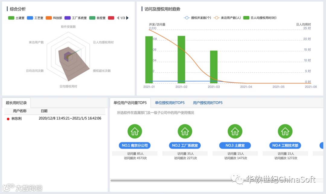 部门层级特有维度分析用于展示部门下软件的用时用量及软件的使用行为习惯、国产软件依赖程度的剖析。