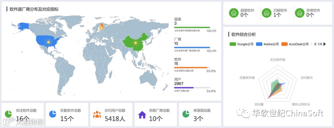 iDiscover通过对软件资产的信息洞察,能够形成软件资产绩效总览信息,这些信息涵盖了在勤软件数量、涉及员工数量、装机情况、关联厂商、用时用量用次、异常及预警等各层级关键属性参数及综合指标。