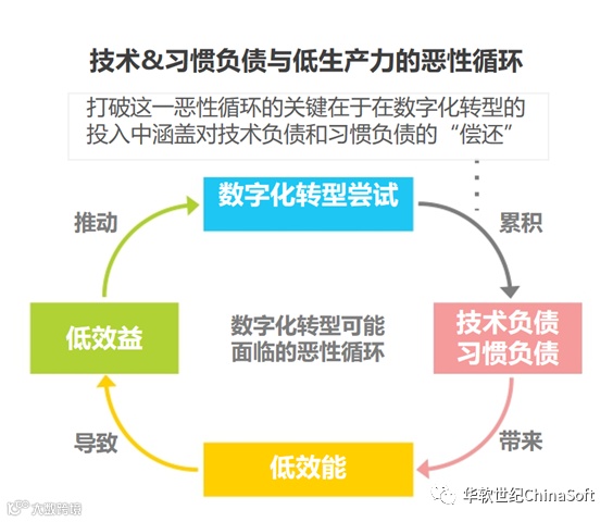 企业在数字化转型中,引进软件肯定是连续不断的,但如果企业推广、培训等工作没做好,反倒有可能产生适得其反的效果,变成技术负债与习惯负债。而目前企业的技术负债与员工的习惯负债依旧普遍存在。
