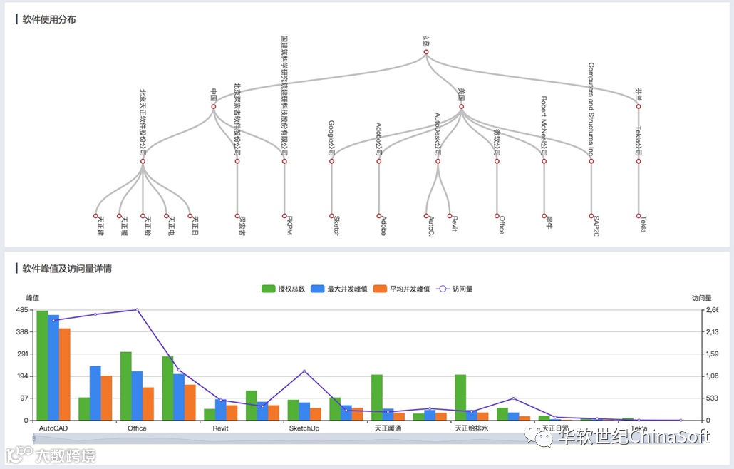 iDiscover支持从软件维度出发,进行授权占用时长与有效时长的对比,以及关联维度综合探索,各软件通过点击可逐个实现联动展示,分析其在生产环境中的有效生产力输出。
