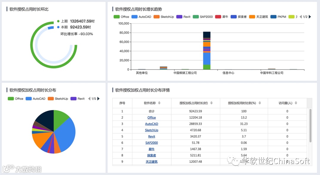 iDiscover通过对关键软件使用时长、占用授权等信息的洞察分析,可以生成软件成本分摊决策参考、全成本核算模式下的软件成本分摊参考。基于软件及各单位资源应用时长,建立成本计量基础。