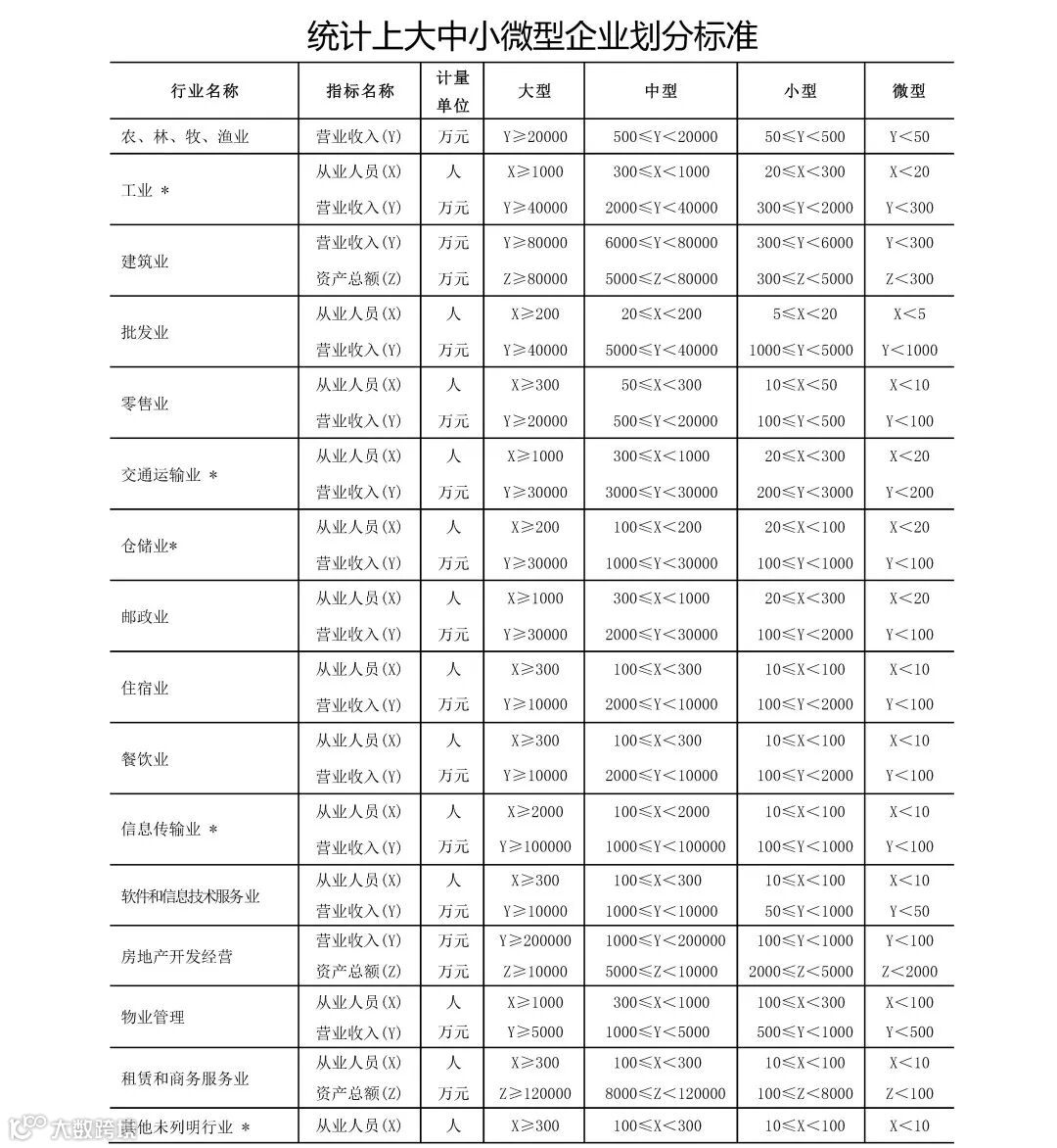 关于大、中、小、微型企业的划型标准,按照国家统计局关于印发《统计上大中小微型企业划分办法(2017)》,按以下划型标准对大型、中型、小型和微型企业进行划分。