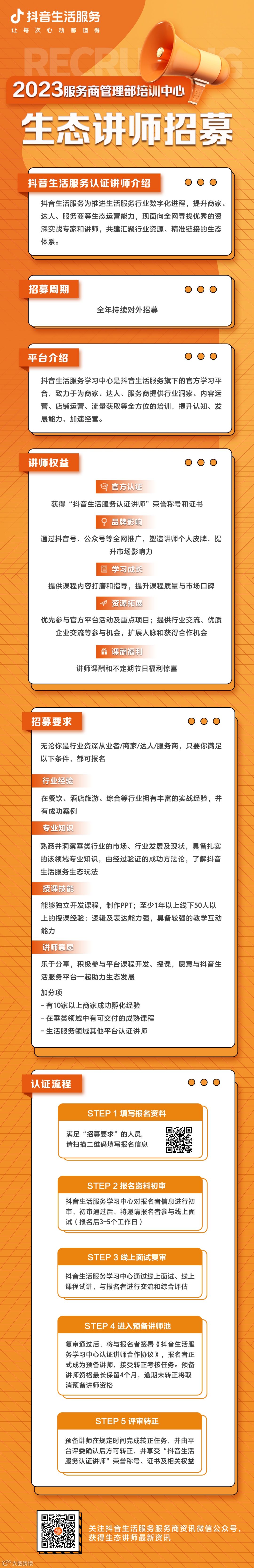 为提升抖音生活服务从业人员的专业能力,服务商管理部面向全网招募实战专家,共建行业资源库,共育生服好生态。