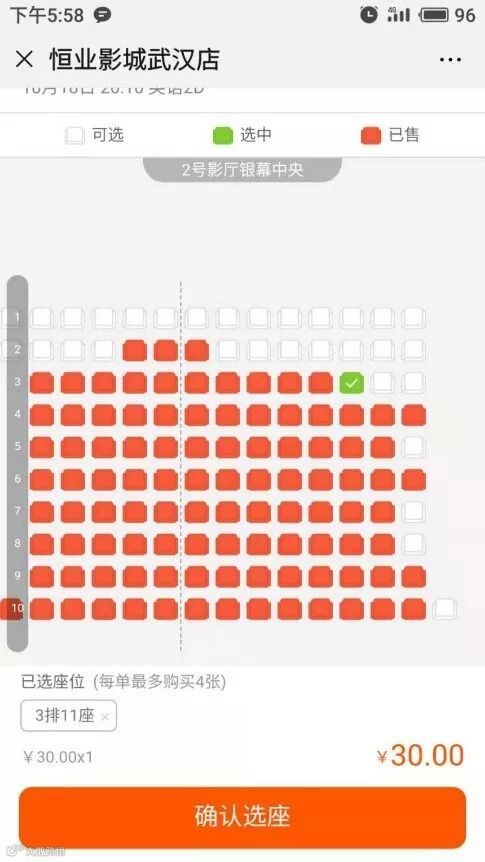2、进入影城界面,选择自己想看的场次和时间,点击购票,进入选座界面,选择空白的座位,点击后出现绿色的✔。