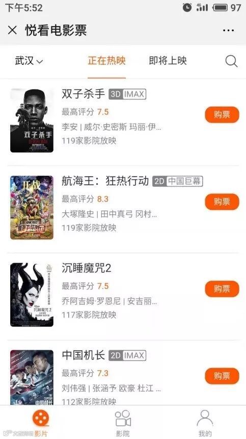 1、点击影片,选择自己想看的片子,进入影城选择界面,选择自己想去观影的影城,全武汉总计121家哦。