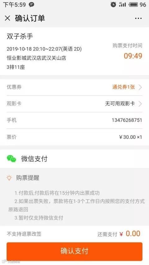 3、确认选座,进入支付界面,系统会默认用优惠券支付,即不用花钱,下面还需支付为0哦,点击确认支付按钮,我们就能购票完成。