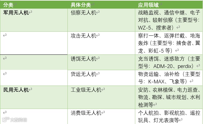 无人机是利用无线电遥控设备和自备的程序控制装置操纵的不载人飞机。机上无驾员,但安装有自动驾驶仪、程序控制装置等设备。地面、舰艇上或母机遥控站人员通过雷达等设备,对其进行跟踪、定位、遥控、遥测和数字传输。从广义上讲有翼导弹也可以算一种无人驾驶的飞机,但本报告所提及的无人机主要是指没有驾驶员的不载人飞机。