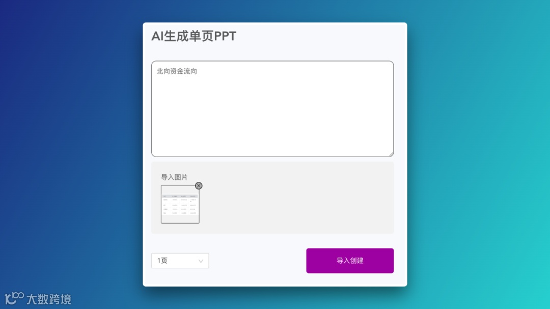您可以仅输入文字或者上传一张图表,自动生成一个单页PPT。