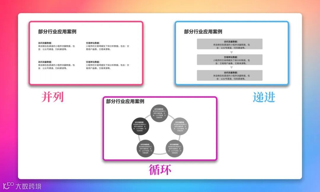 章节主要内容简练提取成为小标题之后,可以依据小标题之间的逻辑关系,使用对应的图示方式进行直观展示,比如并列、递进、树状、循环等。
