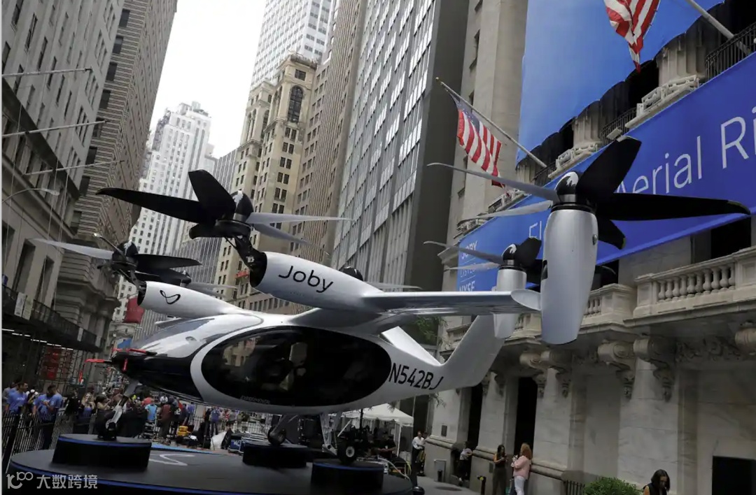2021 年在纽约证券交易所外展示的 Joby 电动空中出租车。图片来源:Andrew Kelly