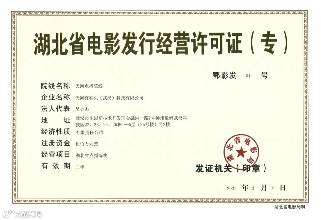 天河点播院线于2021年3月18日获得全国第一家点播院线牌照,获批《湖北省电影发行经营许可证(专)》鄂影发01号,计费系统、版权、运营、播放设备全部合规,天河点播院线代表国内领先水平,拥有海量正版放映权。