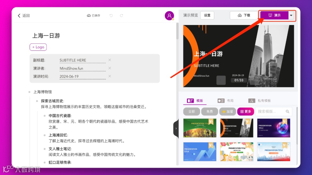 编辑页面,直接点击“在线演示”,即可进入。下载的pptx目前还不支持动画。