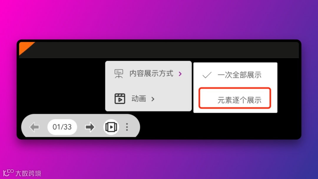 也可以在底部选项条中,“内容展示方式”中选择“元素逐个展示”,就可以实现点击一次鼠标,才显示一段页面内容的功能。