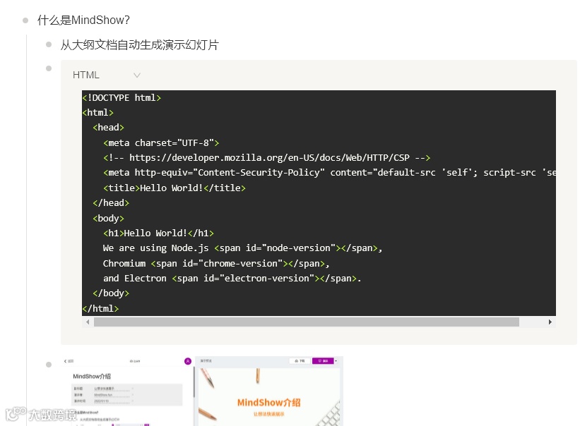 MindShow所思所见支持添加代码块,还可以根据代码语言进行高亮显示,代码语言自动检测如果不准确,也可以自己进行语言类型选择。
