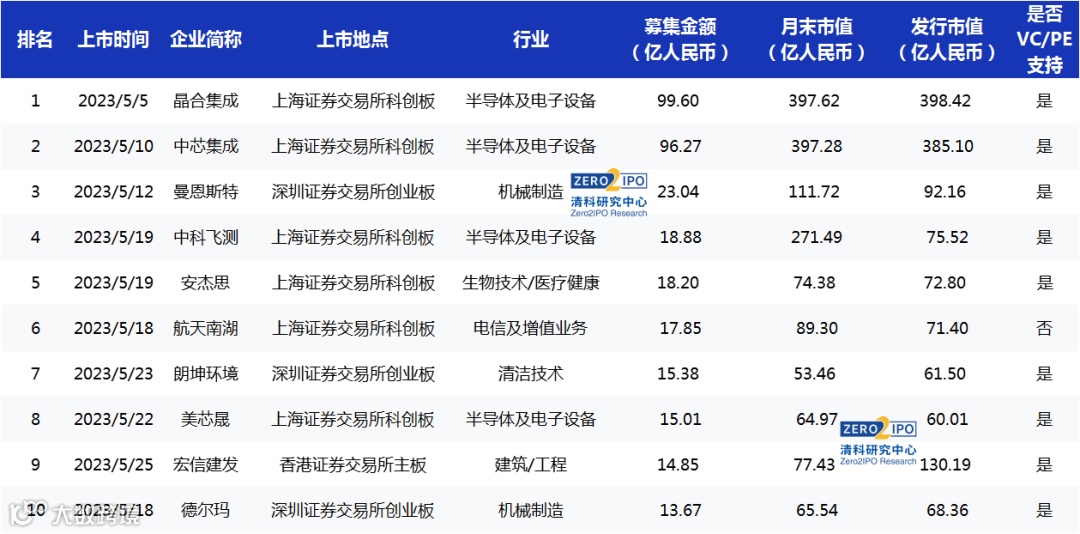 根据清科创业(01945.HK)旗下清科研究中心数据,2023年5月共有35家中国企业【1】在境内外交易所成功上市,总融资额约483.04亿人民币。其中境内上市中企共31家,数量较上月35家有下降,总融资额约461.23亿人民币。本月机械制造行业上市数量共9家居首位。晶合集成登陆上交所科创板,融资额达99.60亿人民币,成为本月单笔融资额最高的上市中企。