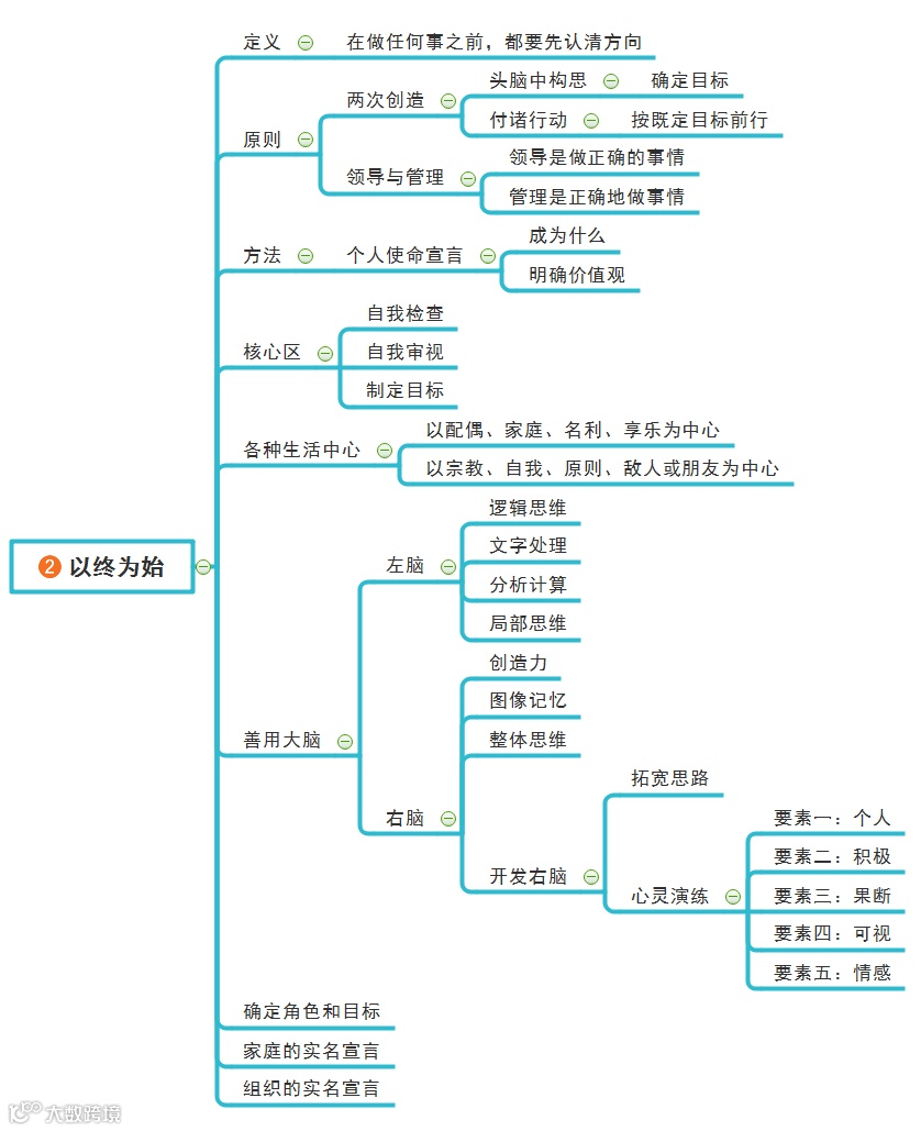 个人、家庭、团队和组织在做任何计划时,均先拟出愿景和目标,并据此塑造未来,全心投注于自己最重视的原则、价值观、关系及目标之上。