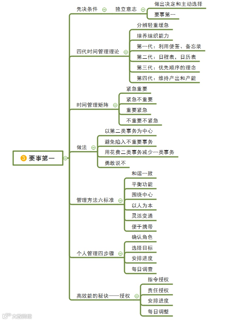 要事第一即实质的创造,是梦想(你的目标、愿景、价值观及要事处理顺序)的组织与实践。次要的事不必摆在第一,要事也不能放在第二。无论迫切性如何,个人与组织均针对要事而来,重点是,把要事放在第一位。