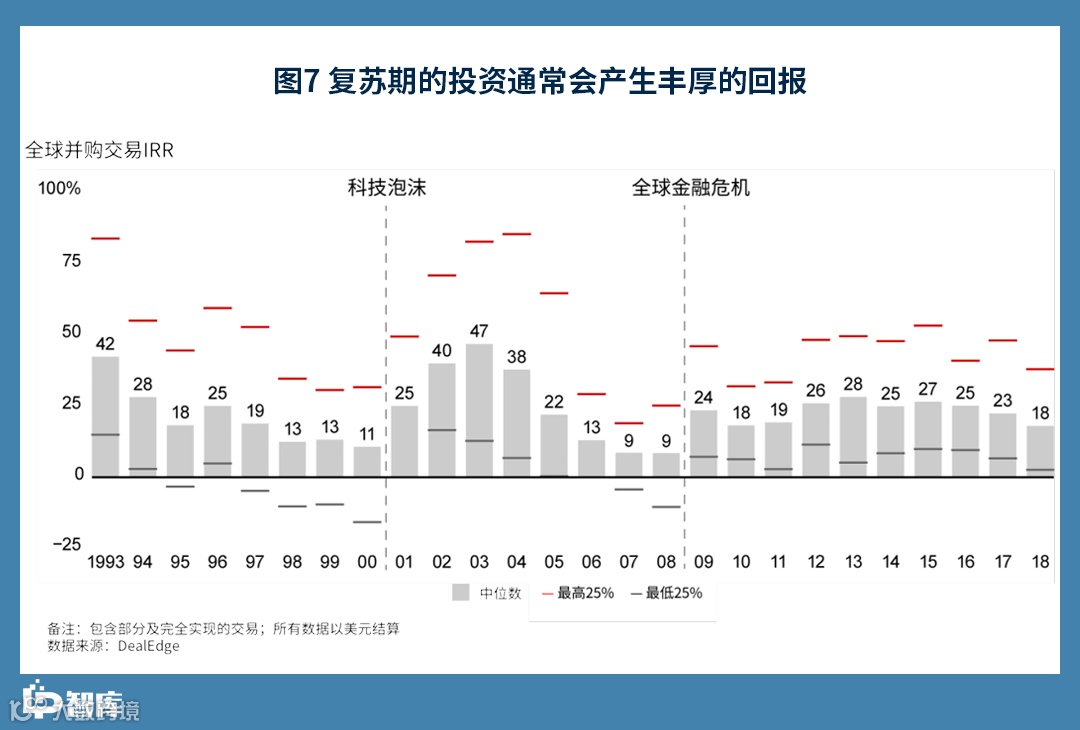 那么,这种动荡的短期前景对GP来说意味着什么?正如我们前面提到的,LP仍然坚定地致力于配置私募股权基金,过去的经验证实了他们穿越周期的价值。如果经济走向衰退,将不可避免地对进入低迷期的投资的内部收益率(IRR)产生影响。然而,在复苏年份进行的投资的内部收益率一直优于长期平均水平,尤其是对回报率处在前四分之一分位的投资(见图7)。