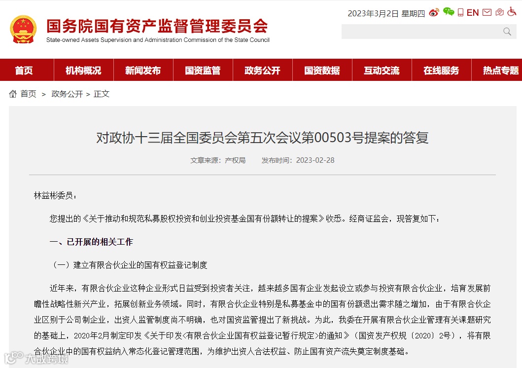 据国资委网站,日前,在对政协十三届全国委员会第五次会议第00503号提案的答复中,国资委表示,将适时出台制度规定及操作细则,探索国有权益份额规范化退出的有效方式和途径,充分发挥有限合伙企业的优势,助力国有企业创新发展。