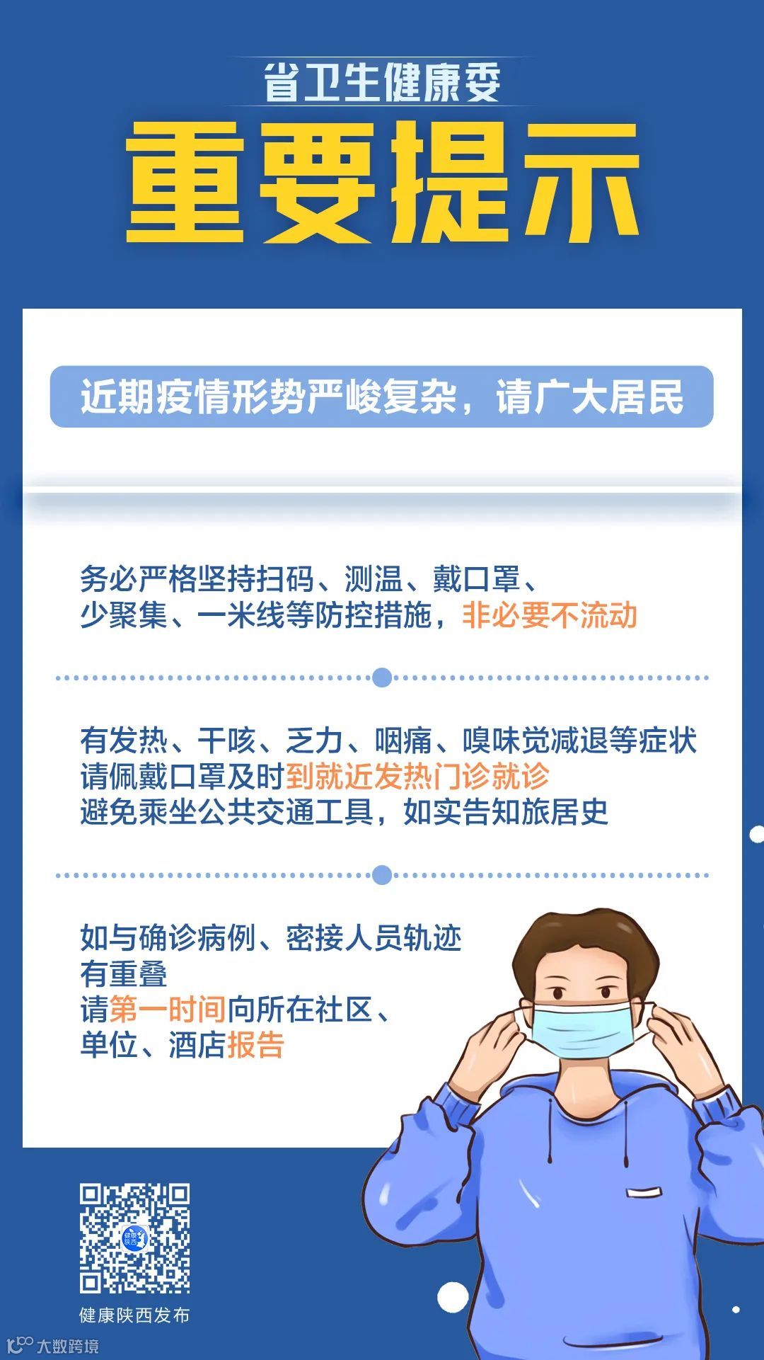 西安市已经划定了8个中风险区,为避免出市离省可能面临健康监测、查验核酸检测证明等不必要的麻烦,请市民朋友在西安市中高风险区清零前,非必要不出市。
