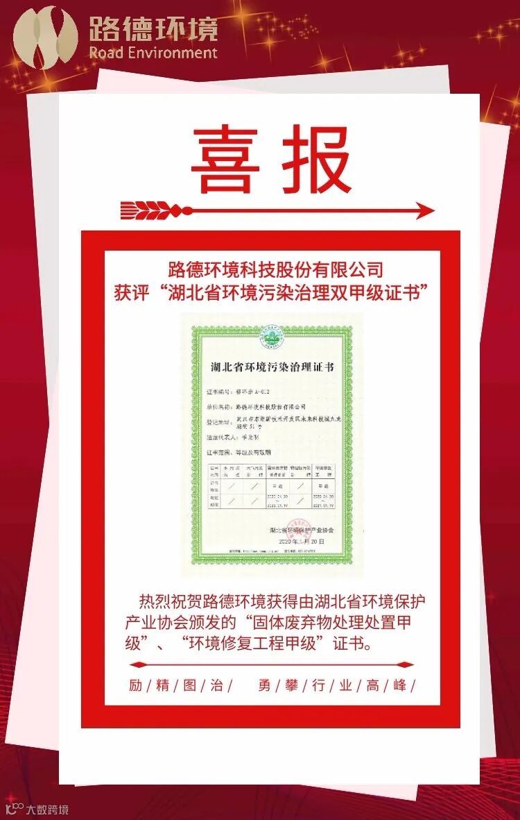 热烈祝贺路德环境荣获“湖北省环境污染治理双甲级证书”