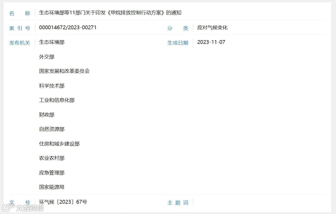 11月7日,生态环境部等11部门联合印发《甲烷排放控制行动方案》的通知,这是我国开展甲烷排放管理控制的顶层设计文件,明确提出了“十四五”和“十五五”期间甲烷排放控制目标。