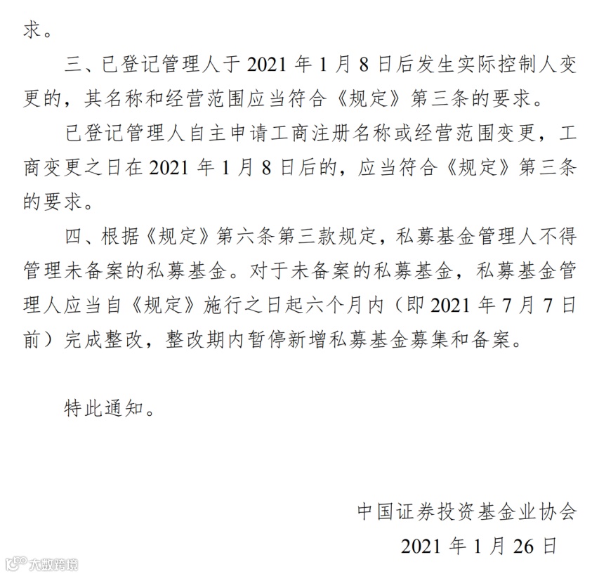 已登记私募管理人于2021年1月8日后发生实际控制人变更的,名称和经营范围应当符合新规要求。