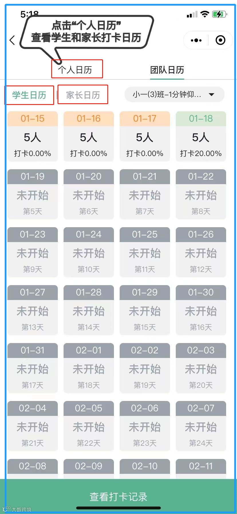 参与个人打卡或团队打卡后,打卡记录可在“打卡日历”中查看。