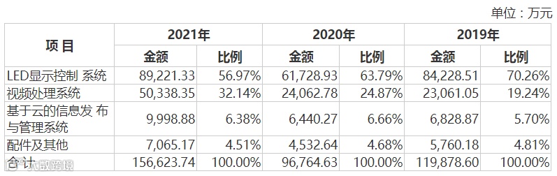 招股书显示,诺瓦星云主要产品包括LED显示控制系统、视频处理系统和基于云的信息发布与管理系统三大类。其中,LED显示控制系统的销售占比最大,分别为70.26%、63.79%和56.97%。