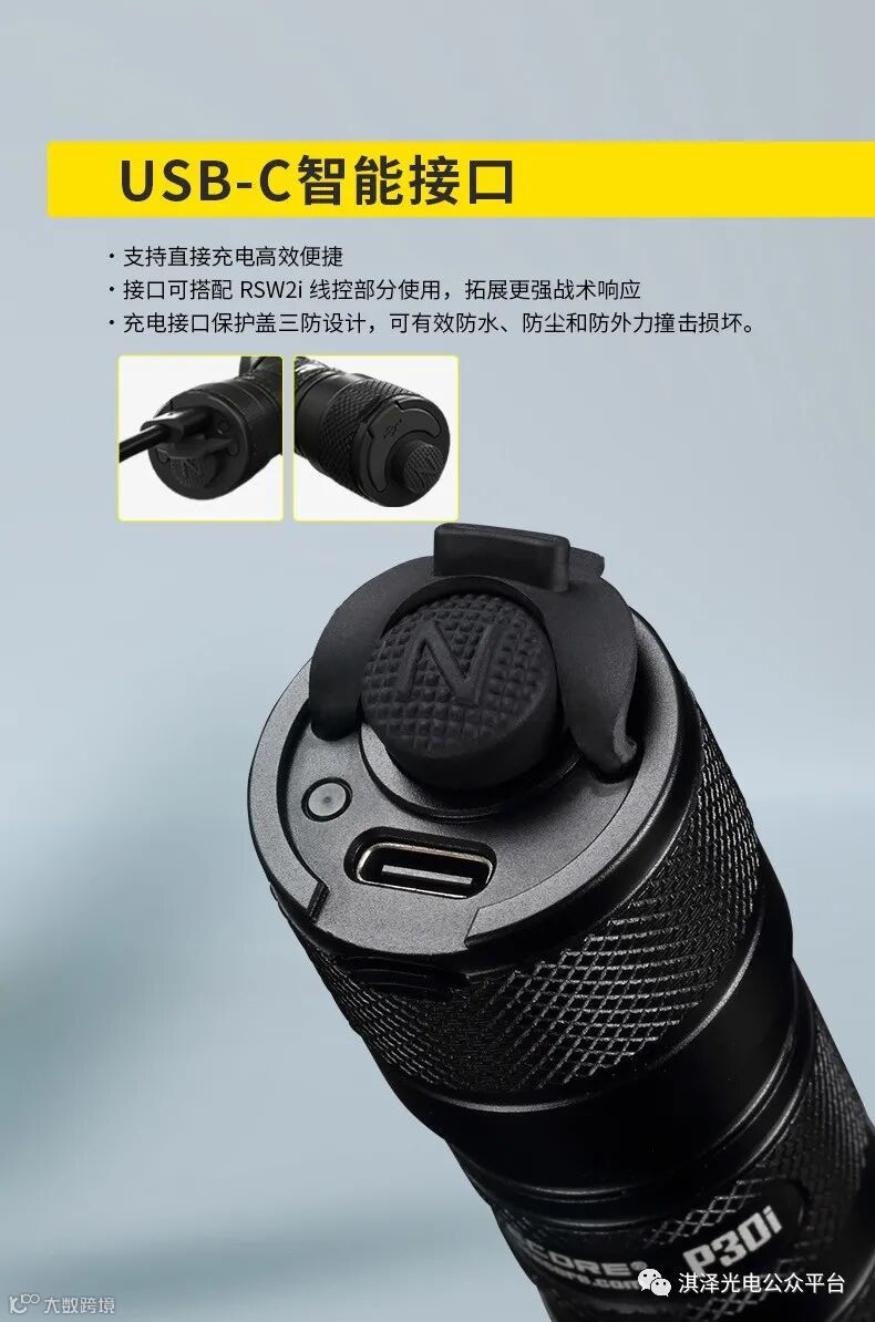 P30i是奈特科尔目前很具有战术特点及优秀远射性能的电筒,不仅有21700 5000mah高容量电池,还有美国超强XHP35HI 2000流明LED,光强达到25万坎德拉,远射达1000米,性能指标相当可观。更为户外战术狩猎爱好者标配了TypeC口连接的线控鼠尾开关,实用性大大提升。同时防护等级达到了IP68,支持水下2米防护和1米防摔。搭配夹具即可实现轻松负载。