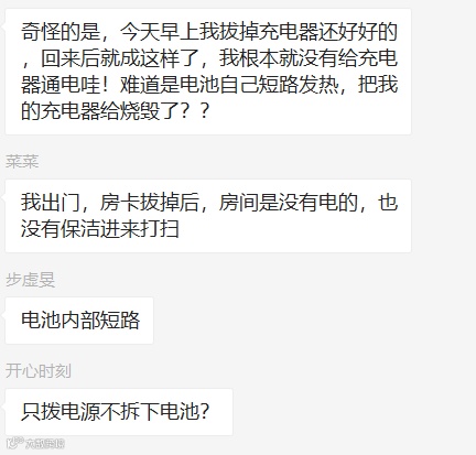 原来是有一位藕粉外出时忘记拔掉充电设备导致设备短路引起电池内部损坏,不过幸运的是没有引起安全事故。