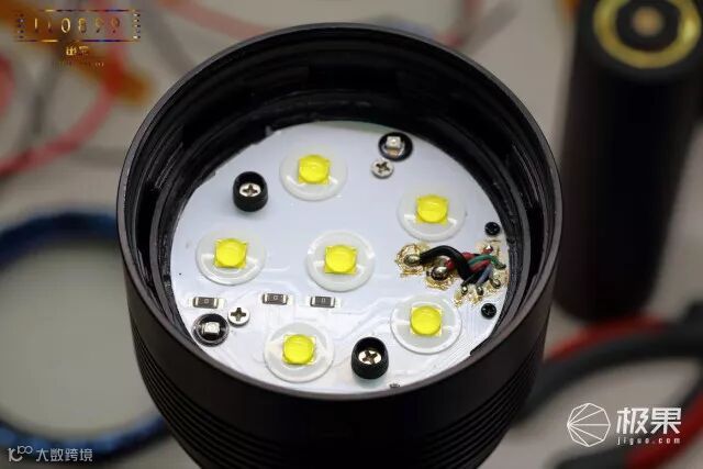 下面就是LED仓了,LED为紫铜热电分离基板,设计的很复杂,6颗XHP70+两个光线传感器+热敏电阻都设计在一个基板上。基板靠4颗大螺丝和2颗小螺丝来和底座固定。
