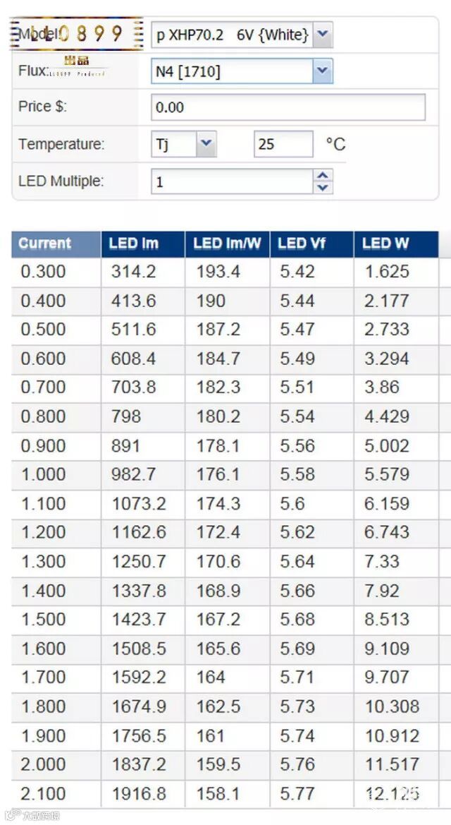 实测功率如下,X9R的最大功率高达200W,这也是2.5W流明电筒应该有的功率。对比光效数据为CREE官网的资料,选择的LED为XHP70.2光通档位选择低一档位的N4档而没有选择光效的P2,目的是为了中和反射损耗。实测和OLIGHT官方的光通量很接近。