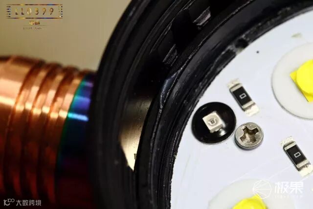 上面拆完了下面就是电路仓了,电路仓由一个铝合金的盖子封住,也是螺丝固定的,而且每颗螺丝的深孔内都有透明的灌封胶密封,想拆掉螺丝很费事。另外电路仓盖的侧面和电筒之间是没有密封结构的,但是olight电路仓盖子的底部和桶身之间设置了两道密封圈,也能起到不错的密封作用。