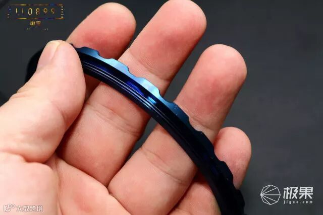 既然拆主体肯定是从灯头开始了,X9R采用PVD成蓝色的不锈钢压环,也是今年OLIGHT的招牌工艺,硬度还耐久性都不用担心。压环上有微皇冠凸起,十分漂亮。
