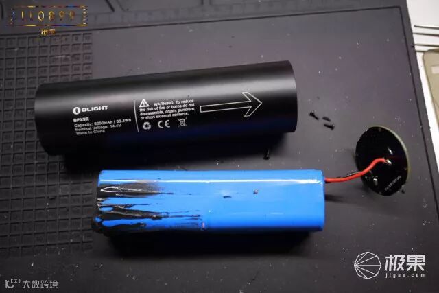 内部可以清晰可见电池包,但是想拆出电池包可费事了,OLIGHT在电池包和电池桶身之间灌入了不少的密封胶,在费了九牛二虎之力后终于把电池包成功拽出。