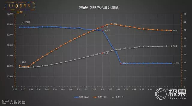 而X9R强在持续能力,其实我本人对曲线这种东西一直不感冒,纠其主要原因是因为环境不同这个曲线的测试结果差异很大。为了保证测试环境统一,在空调室内恒温25度,在X9R的内部散热片上和外壳上分别安置了两个测温探头。在1米距离上放置照度计。